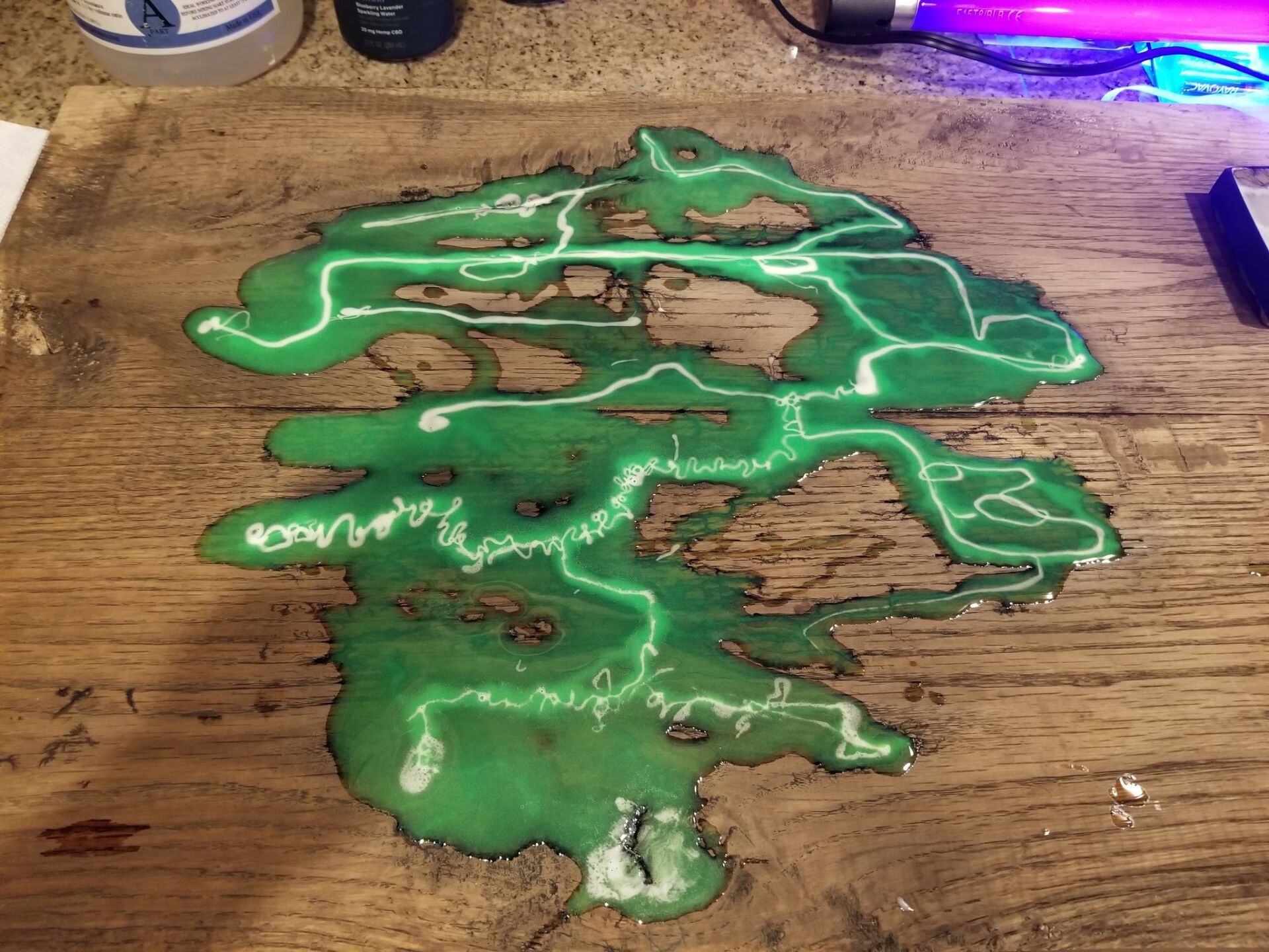 Our experts have training and experience of Lichtenberg Wood Burning and will create a glow-in-the-dark epoxy that charges during the day and glows at night. We use bright green and blue colors for an amazing look.