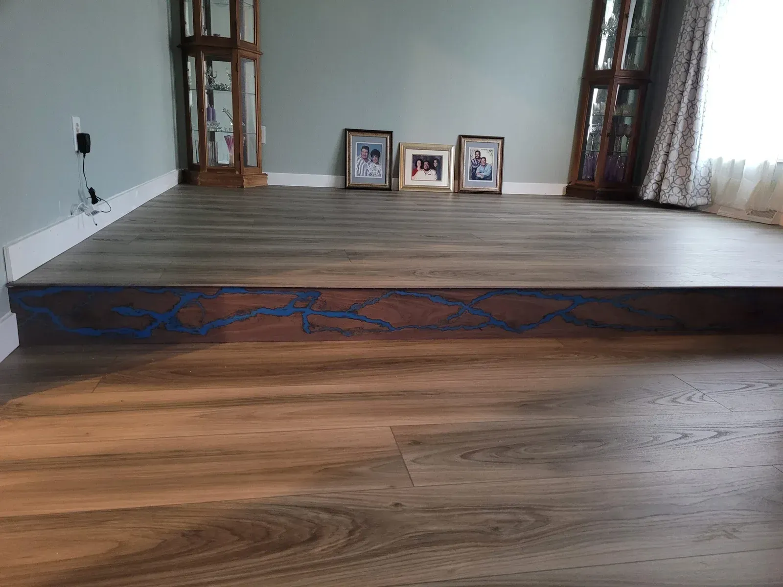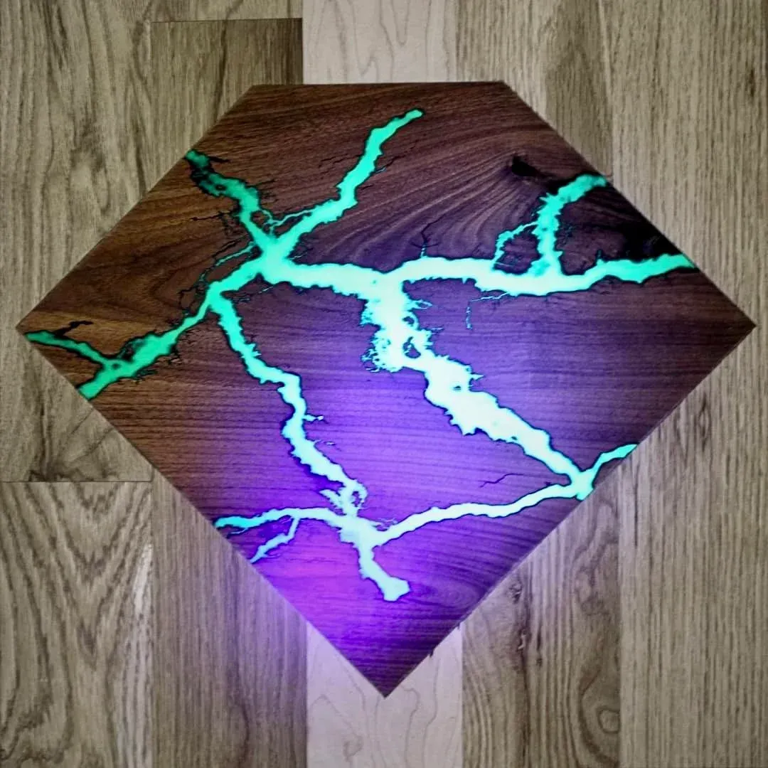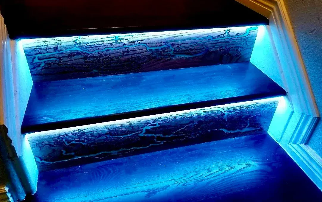 We also offer CalaSmoke, our signature electro-burning technique that turns hardwood into functional art. Using high-voltage electricity, we create bold, branching patterns, known as Lichtenberg figures, burned directly into each tread. No stains, no stamps, no shortcuts. This is a permanent process that reacts with the wood itself, leaving behind deep, organic designs that are sealed in crystal-clear epoxy.